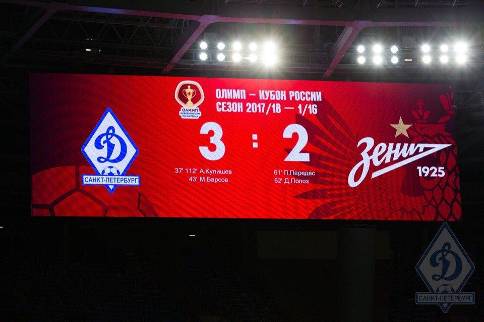 1. «Динамо» победило «Зенит» впервые за 52 года. Настоящую сенсацию устроила команда Александра Точилина в матче 1/16 финала Кубка России, одержав победу над явным фаворитом встречи (3:2) при том, что номинально домашнюю игру бело-голубые проводили на стадионе «Санкт-Петербург». Первый тайм полностью остался за динамовцами, которые воспользовались удалением Михи Мевли и забили два мяча, однако «Зенит» смог вернуться в игру во второй половине, сравнял счет и перевел игру в дополнительное время. Однако с течением времени инициатива вновь вернулась к «Динамо», которые активно атаковали в концовке игры, а в одном из моментов Максим Барсов заставил ошибиться 18-летнего защитника «Зенита» Кирилла Капленко, заработав одиннадцатиметровый. Артем Кулишев реализовал и вывел команду в 1/8 финала Кубка России, повторив клубный результат сезона 2002/03, когда бело-голубые с таким же счетом и так же в дополнительное время обыграли ЦСКА.